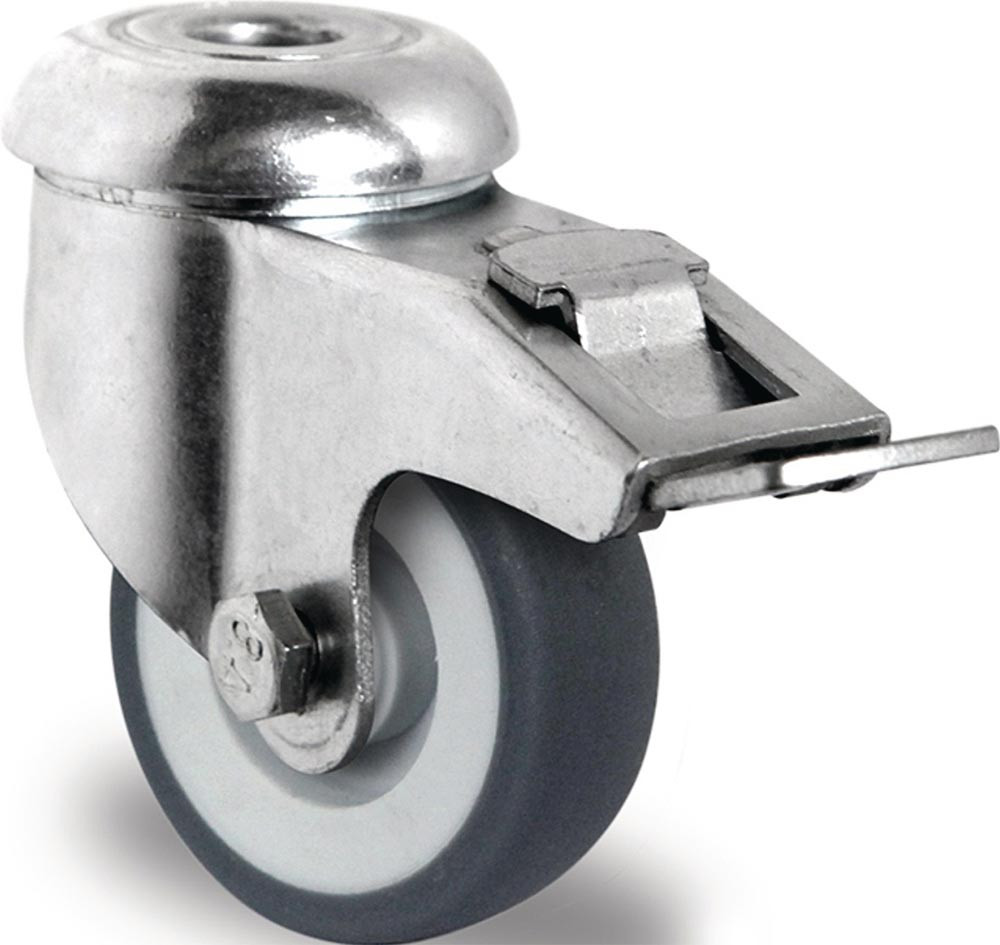 Apparaterolle · galvanisch blau verzinktes Stahlblechgehäuse · korrosionsunempfindlich · zweireihiger Kugelkranz im Gabelkopf · thermoplastische Gummibereifung (grau) auf Kunststoff-Felge · Gleitlager · Befestigung durch Rückenloch-Ø 11 mm · Totalfeststeller nachlaufend montiert