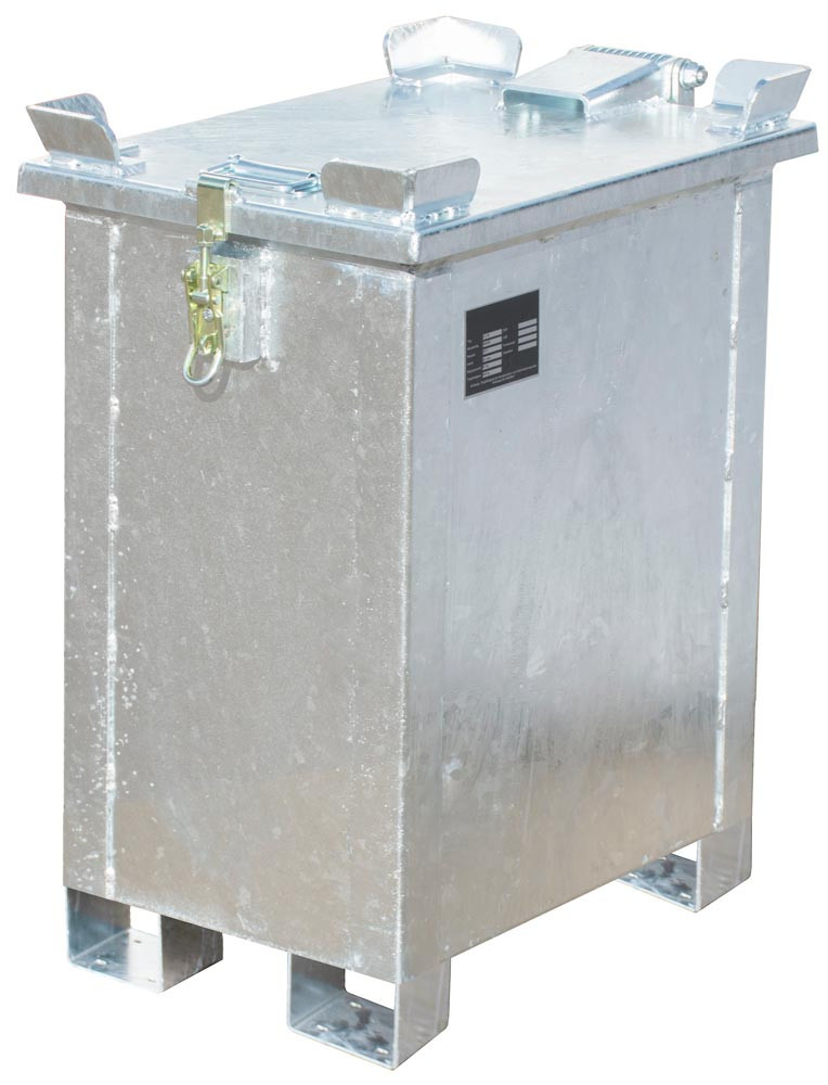 · Zur sicheren Lagerung von beschädigten und defekten Lithium - Ionen - Batterien · Abschließbarer Deckel · Ab Volumen 90 Liter mit Deckelstütze · Material: Stahlblech, verzinkt · Herausnehmbarer Innenbehälter · Optimaler Brandschutz durch patentiertes Füllmittel zwischen Innen- und Aussenbehälter sowie im Deckel · Stapelecken, 3-fach stapelbar · Unterfahrhöhe 100 mm