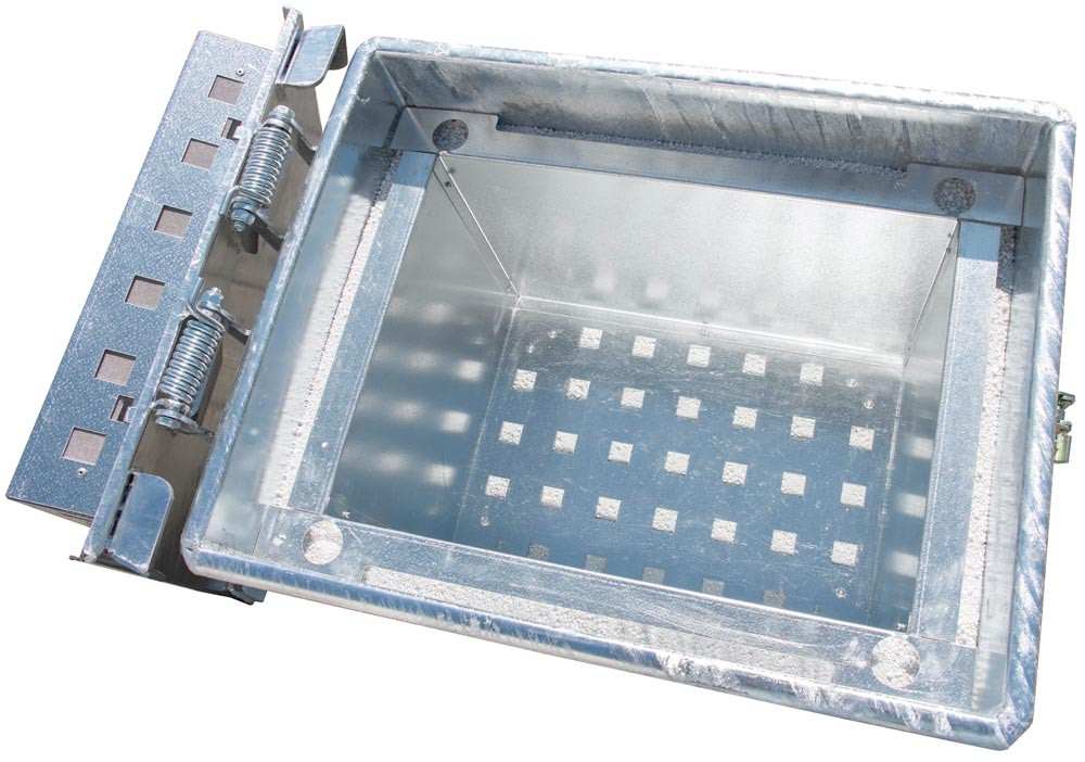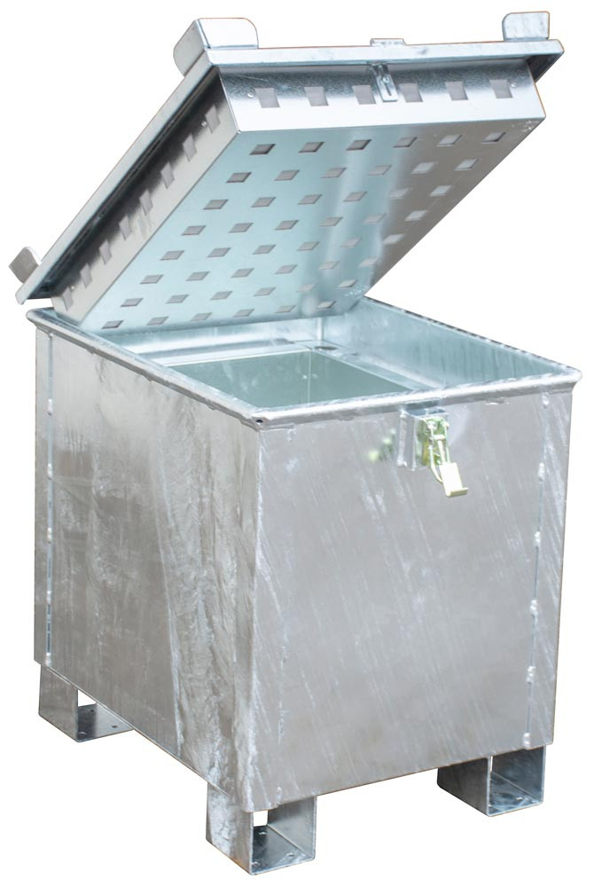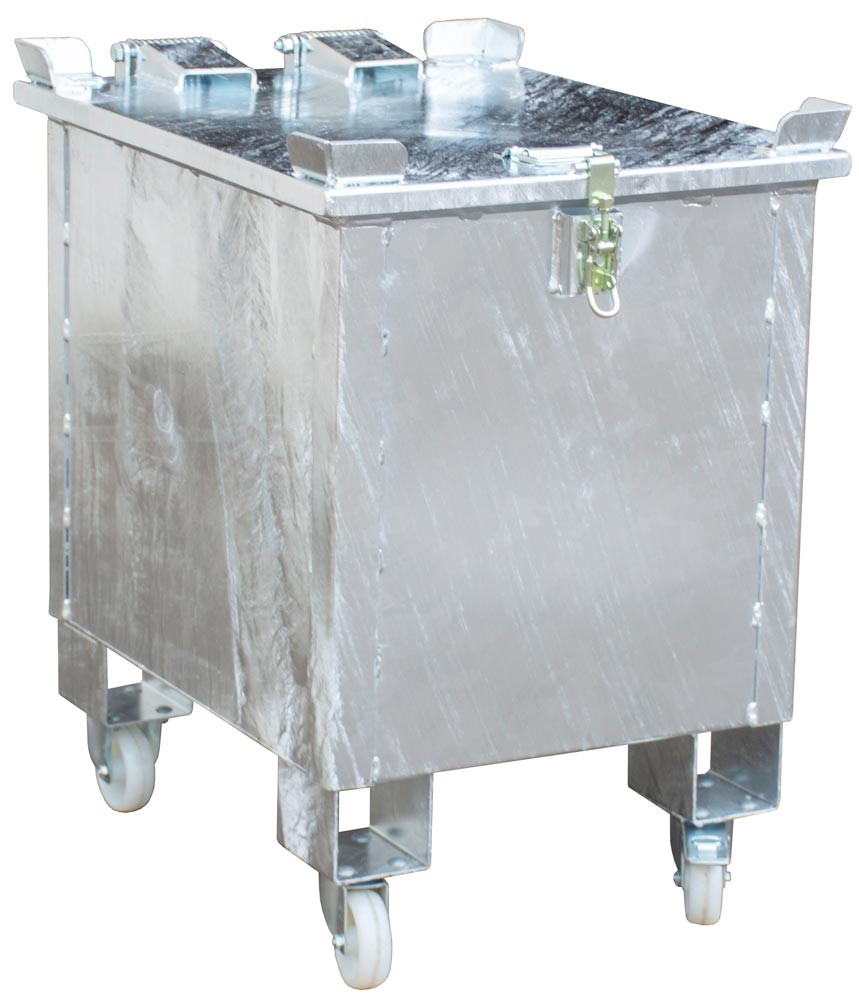 · Zur sicheren Lagerung von beschädigten und defekten Lithium - Ionen - Batterien · Abschließbarer Deckel · Ab Volumen 90 Liter mit Deckelstütze · Material: Stahlblech, verzinkt · Herausnehmbarer Innenbehälter · Optimaler Brandschutz durch patentiertes Füllmittel zwischen Innen- und Aussenbehälter sowie im Deckel · Stapelecken, 3-fach stapelbar · Unterfahrhöhe 100 mm