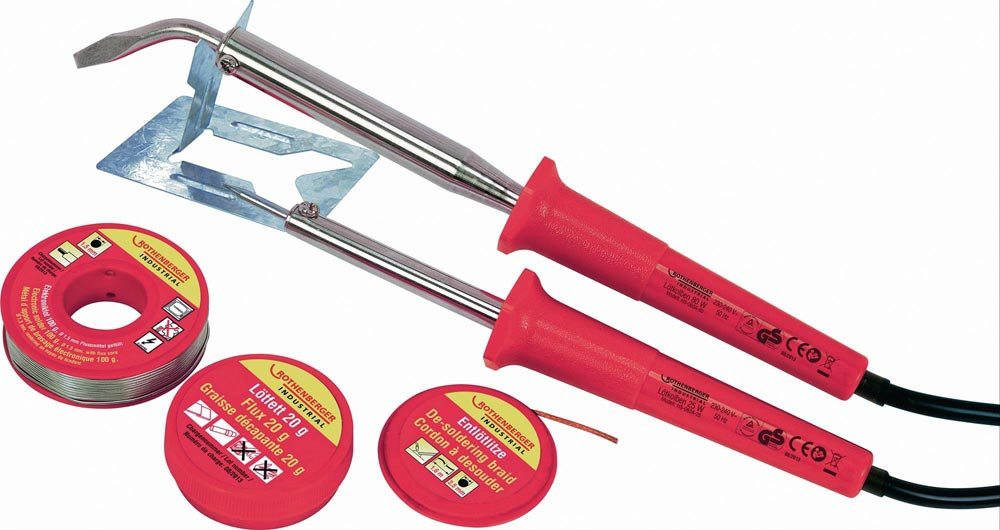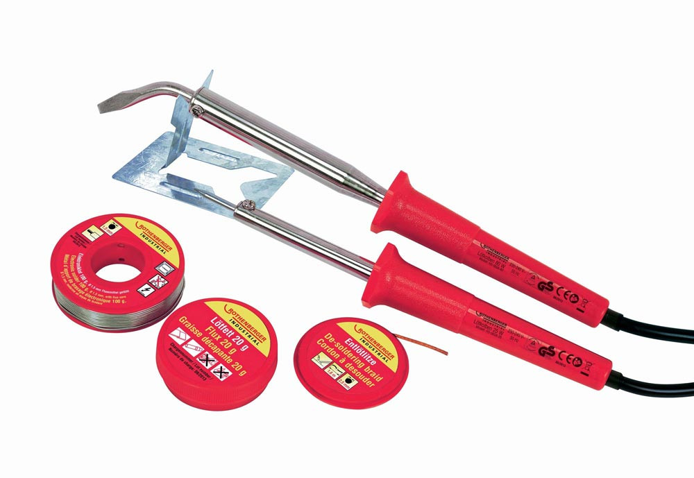 Lieferung: Lötkolben 25 W inkl. Lötspitze (gebogen/flach), Lötkolben 80 W inkl. Lötspitze (gerade/spitz), Lötfett 20 g, Entlötlitze 2,5 mm x 1,6 m, Elektroniklot 35 g