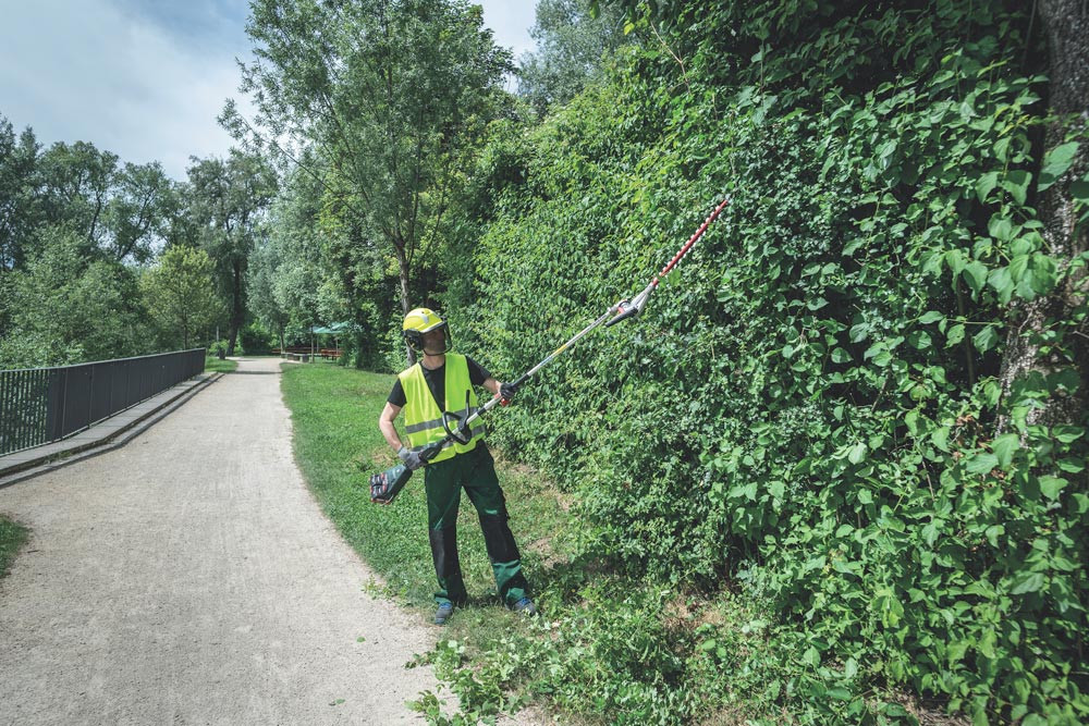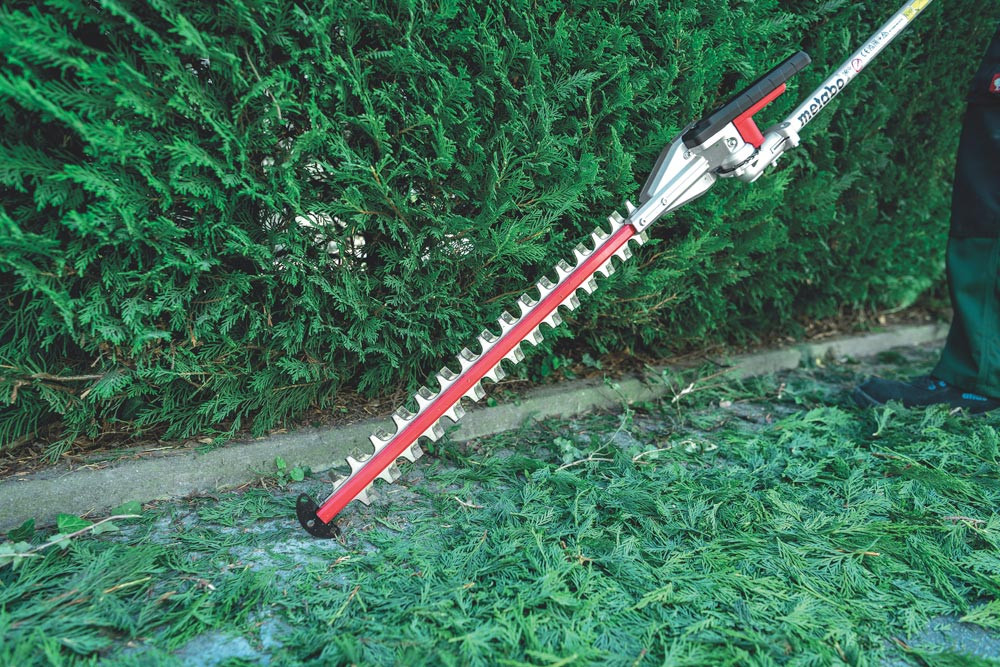 Ausführung: Zum Schneiden von hohen Hecken und Sträuchern mit dem Heckenscheren-Aufsatz des Metabo Multifunktionssystems ∙ Zusammen mit dem Akku-Multifunktionsantrieb MA 36-18 LTX BL Q ein umweltfreundliches, leises System, ideal für lärmsensible Bereiche ∙ Quick Schnellkupplungssystem für werkzeuglosen Aufsatzwechsel ∙ Hocheffizientes, präzises Dual-Schnittsystem durch beidseitig diamantgeschliffene und lasergeschnittene Messerzähne ∙ Messerbalken werkzeuglos schwenkbar um 215° in 13 Stufen für den optimalen Winkel je nach Arbeitssituation ∙ Anstoßschutz schützt Anwender und Getriebe vor Rückschlägen bei Arbeiten in Wand- und Bodennähe ∙ Robust im Einsatz durch langlebiges Metallgetriebe ∙ Einfacher Transport und platzsparende Lagerung mit eingeklapptem Messerbalken