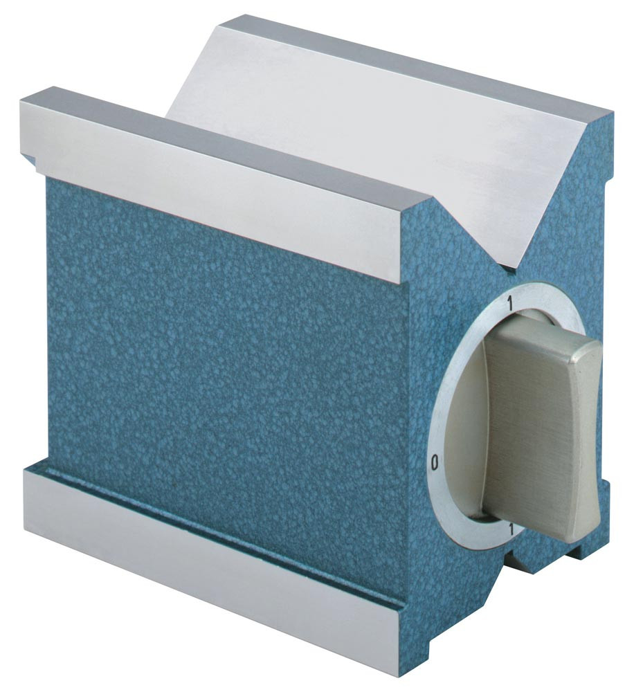 mit abschaltbarem Magnet durch Drehschalter · Schalter Aluminium eloxiert · Magnet aus Stahl · Messfläche und Prisma gehärtet · Präzisionsprisma genau eben, parallel und winkelgenau fein geschliffen · zum Messen, Anreißen und Bearbeiten von Werkstücken