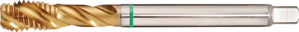 HSS-Co · Form C · Typ UNIVERSAL · TiN-beschichtet · Grünring · mit Rechtsdrall 40° · Flanken hinterschliffen · metrisches ISO-Gewinde · DIN 13 Blatt 1 · Toleranzfeld ISO2 (6H) · für Sacklochgewinde · für Stahl, rostfreie Stähle, Sphäroguss und NE-Metalle