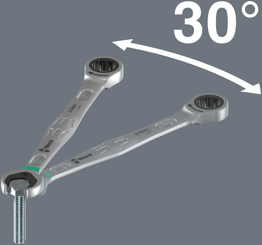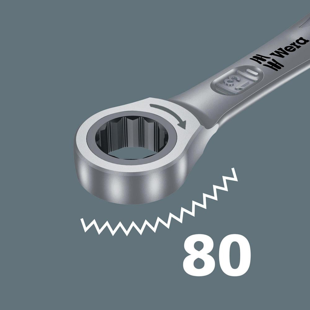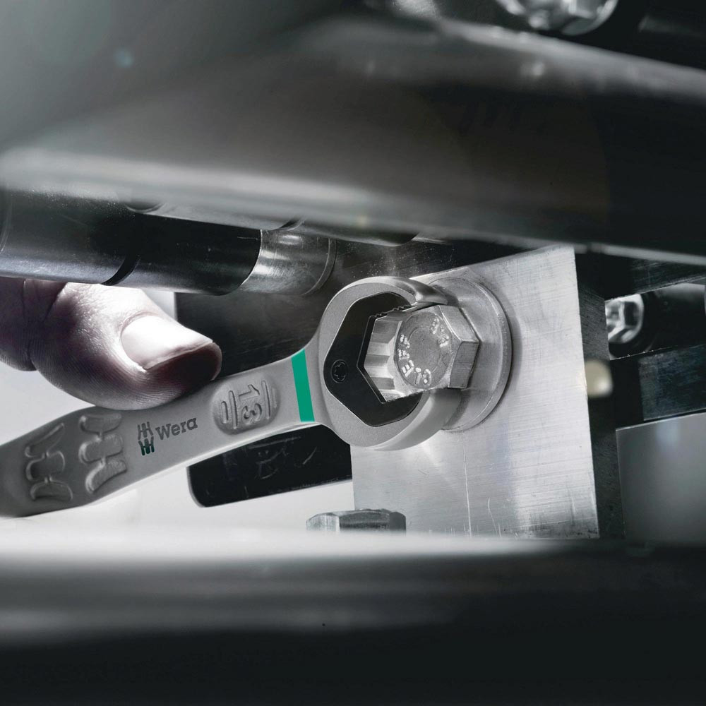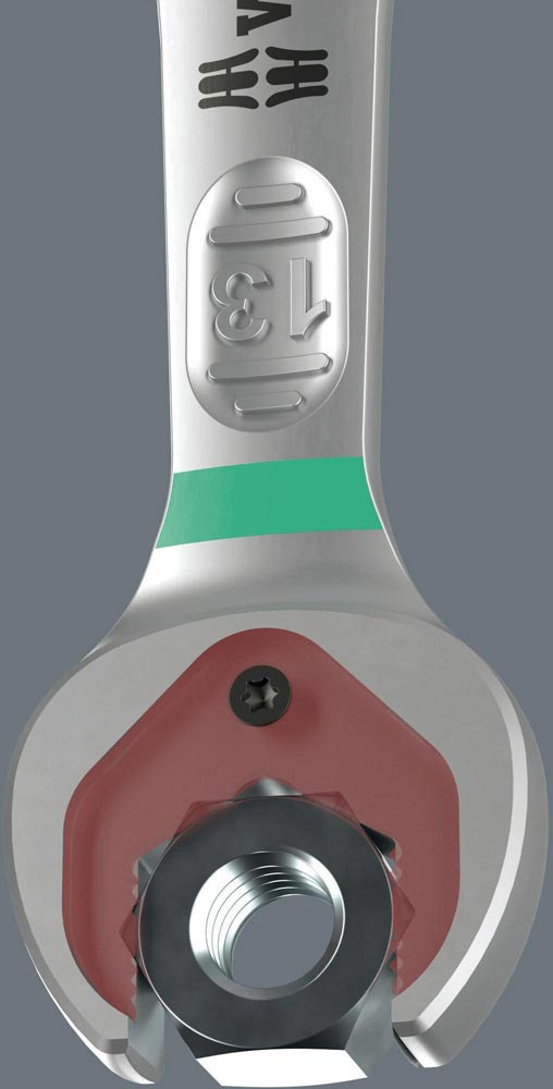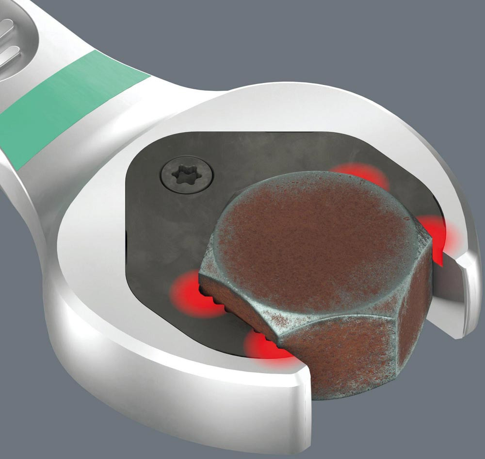 für Sechskant-Schraubenköpfe bzw. -Muttern · mit Haltefunktion durch Metallplatte im Maul, die die Gefahr des Verlierens von Schrauben und Muttern reduziert · auswechselbare Metallplatte im Maul sichert mit extra harten Zähnen Schrauben und Muttern und reduziert die Abrutschgefahr · integrierte Endanschlag kann das Abrutschen vom Schraubenkopf nach unten verhindern und ermöglicht das Aufbringen hoher Drehmomente · Doppelsechskantgeometrie sorgt für die formschlüssige Verbindung mit Schraube oder Mutter und damit für die Verringerung der Abrutschgefahr · Rückschwenkwinkel von nur 30° auf der Maulseite vermeidet zeitintensives Wenden des Schlüssels beim Schrauben · Ratschenmechanik auf der Ringseite mit außergewöhnlich hoher Feinverzahnung von 80 Zähnen für Flexibilität auch in engen Bauräumen · spezielle Schmiedegeometrie sorgt für hohe Drehmomentübertragung und hohe Biegungssteifigkeit · gefertigt aus leistungsfähigem Chrom-Molybdän-Stahl mit Nickel-Chrom Beschichtung für hohen Korrosionsschutz · mit Werkzeugfinder ″Take it easy″: Farbkennzeichnung nach Größen · CV-Molybdän nickel-chrom-beschichtet