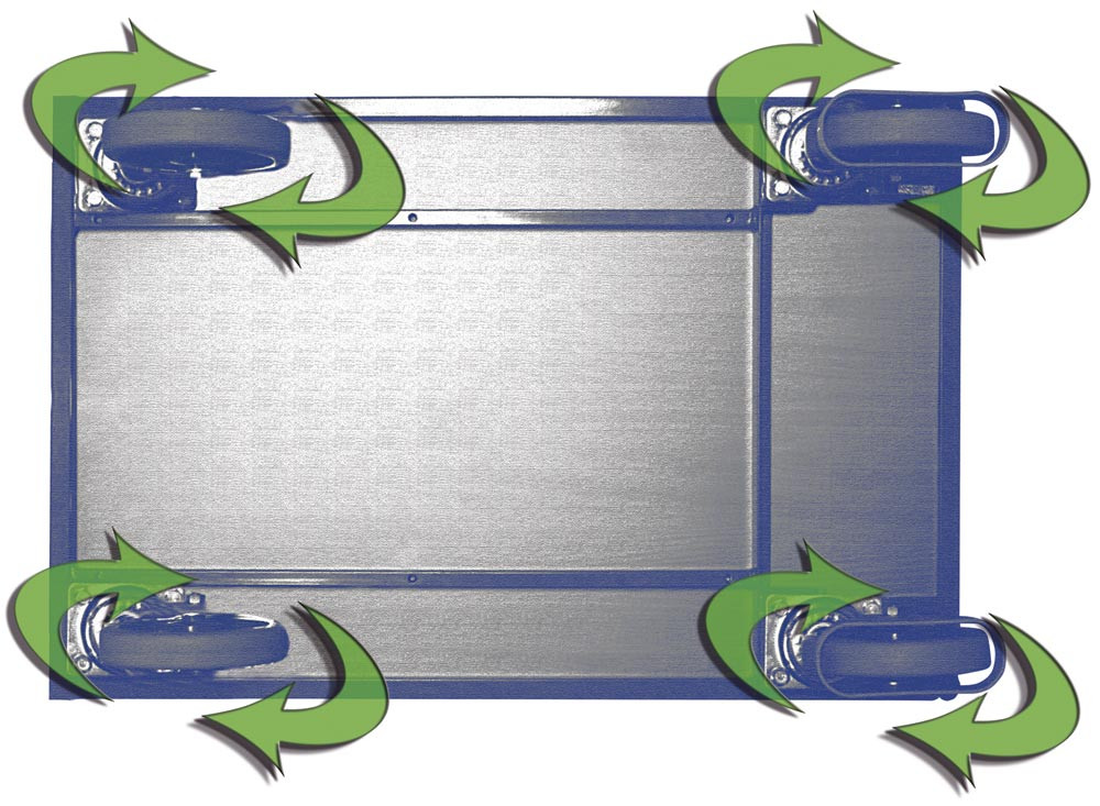 · Anstatt 2 Lenk- und 2 Bockrollen · Dadurch wird der Wagen sehr wendig und kann auf der Stelle drehen