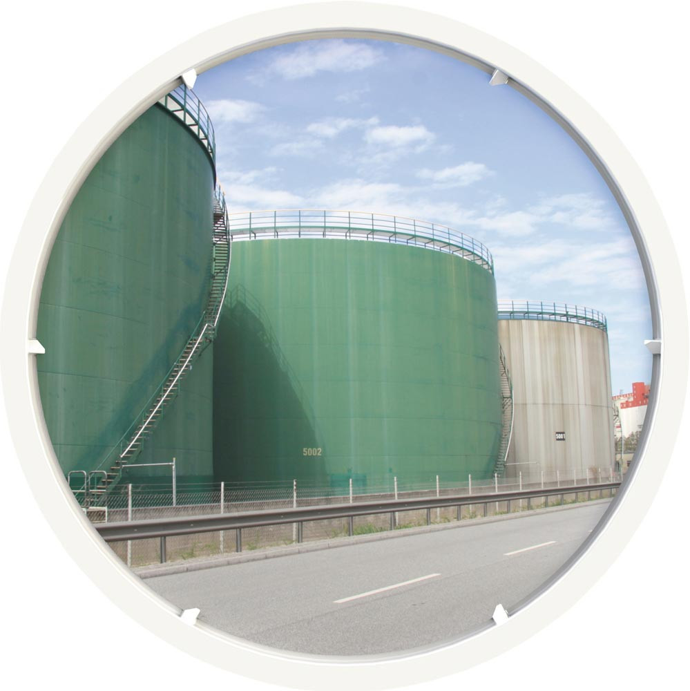 für Innen- und Außenbereich · zur Beobachtung von Produktionsabläufen und Arbeitsplätzen, von toten Ecken und Winkeln · zur Überprüfung von zwei Richtungen · ca. 110° Blickwinkel · Spiegelfläche aus stoßfestem Acryl (PMMA) · Rückwand und Rahmen aus weißem, schlagfestem und UV-stabilem Kunststoff · inkl. Halterung für Pfosten, Ø 50-85 mm · einfache Montage
