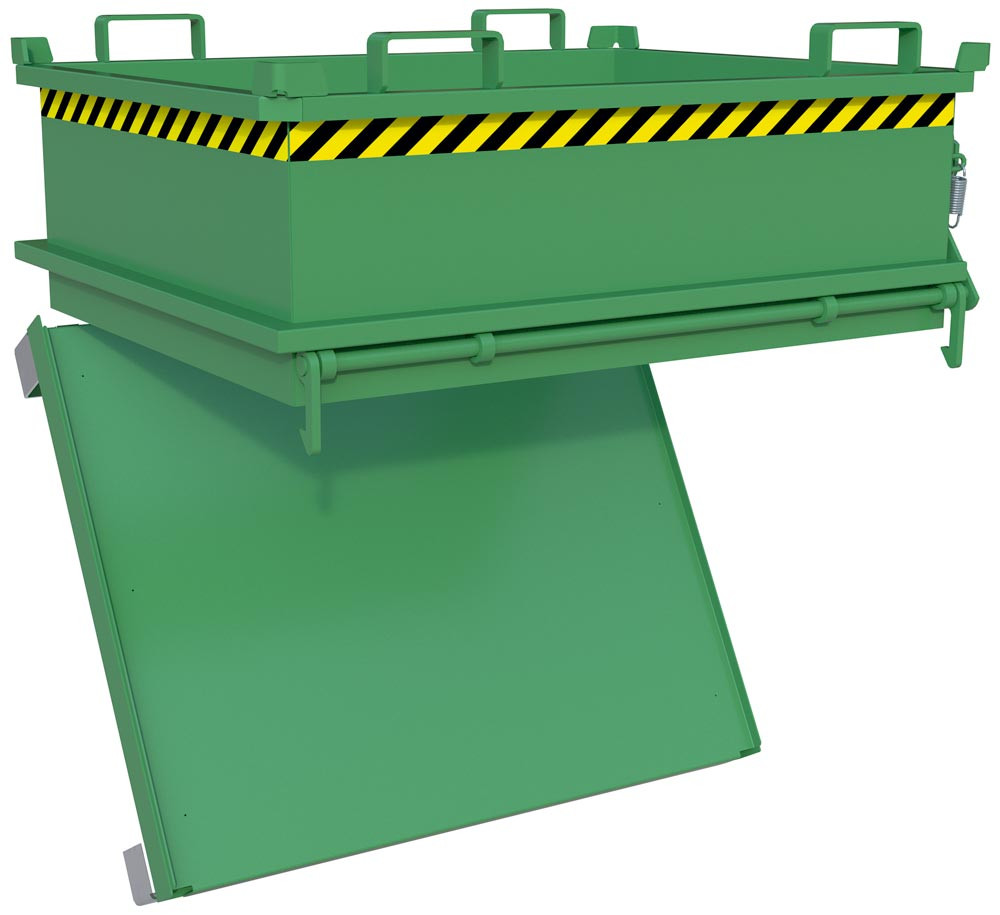 · Ideal überall dort einsetzbar, wo wenig Platz ist · Robuste Stahlkonstruktion mit glatten Innenwänden · Entriegelung der Bodenklappe per Seilzug vom Staplersitz · Bodenklappe schließt beim Aufsetzen selbsttätig · Sicherung gegen unbeabsichtigtes Abrutschen und Öffnen der Bodenklappe · Durch 100 mm Unterfahrhöhe mit Gabelhubwagen transportierbar · 3-fach stapelbar