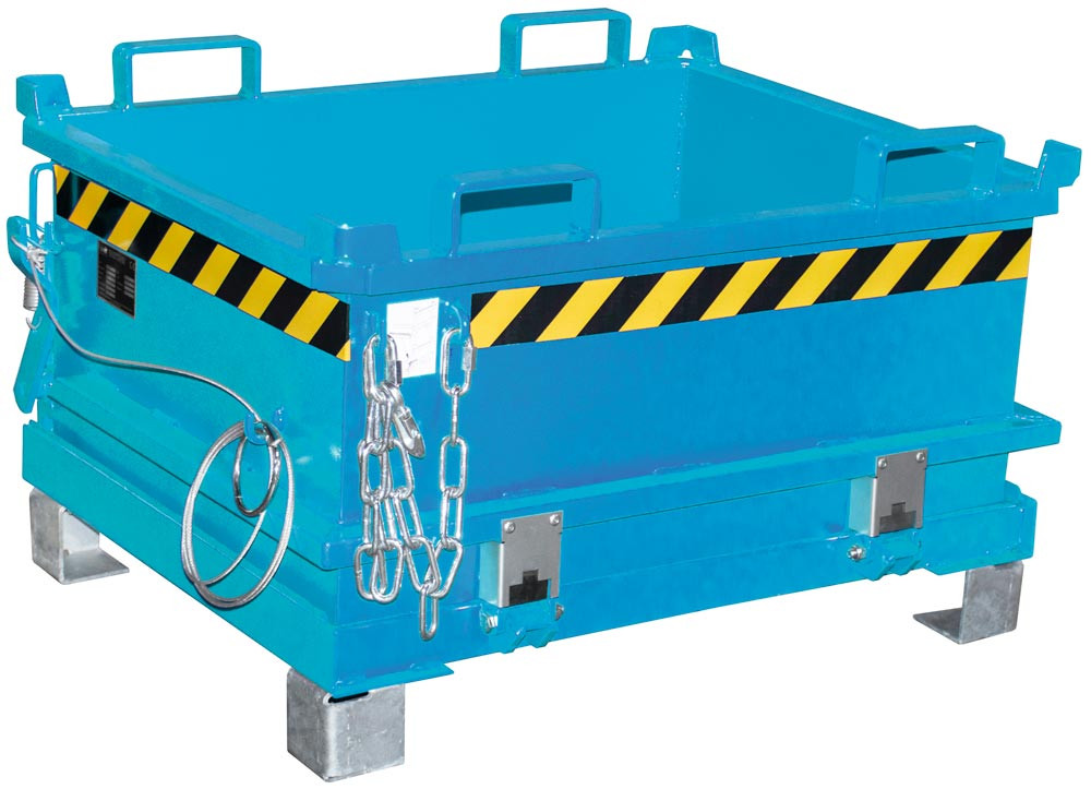 · Ideal überall dort einsetzbar, wo wenig Platz ist · Robuste Stahlkonstruktion mit glatten Innenwänden · Entriegelung der Bodenklappe per Seilzug vom Staplersitz · Bodenklappe schließt beim Aufsetzen selbsttätig · Sicherung gegen unbeabsichtigtes Abrutschen und Öffnen der Bodenklappe · Durch 100 mm Unterfahrhöhe mit Gabelhubwagen transportierbar · 3-fach stapelbar
