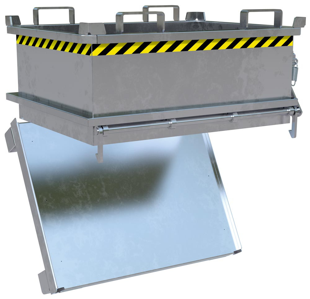 · Ideal überall dort einsetzbar, wo wenig Platz ist · Robuste Stahlkonstruktion mit glatten Innenwänden · Entriegelung der Bodenklappe per Seilzug vom Staplersitz · Bodenklappe schließt beim Aufsetzen selbsttätig · Sicherung gegen unbeabsichtigtes Abrutschen und Öffnen der Bodenklappe · Durch 100 mm Unterfahrhöhe mit Gabelhubwagen transportierbar · 3-fach stapelbar