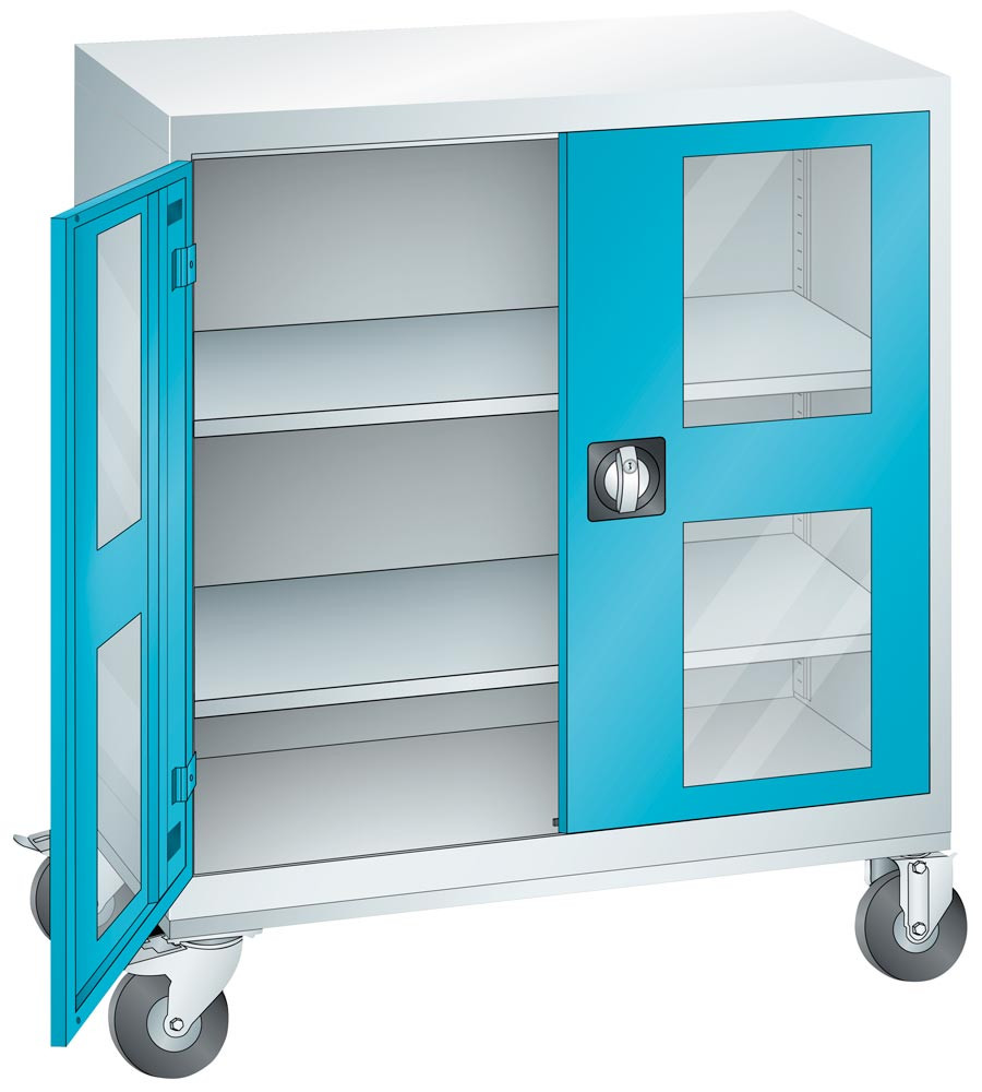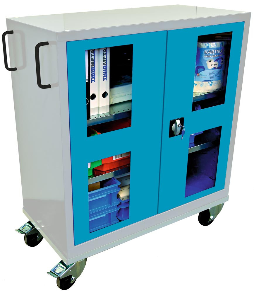 Mobiler Flügeltürenschrank mit Sichtfenstern, BxTxH 1005x500x1195 mm, 2 Fachböden, verzinkt, TL 100 kg, RAL 7035/5012