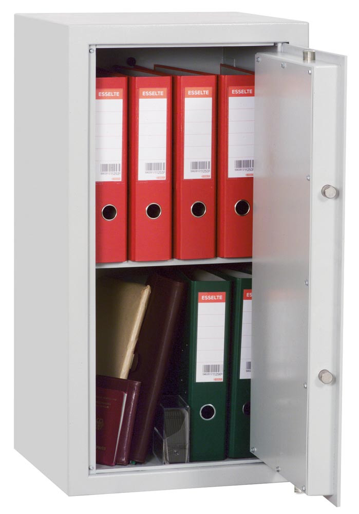 · Tür doppelwandig, mit dreiseitiger Verriegelung durch Schließbolzen · Hochwertige Feuerisolierung und umlaufende Feuerfalz · Beschlag und Scharniere 12 mm vorstehend · Klappgriff mit Doppelbartsicherheitsschloss und 2 Schlüsseln · Je zwei Bohrungen in Rückwand und Boden zur Befestigung · Lackierung in RAL 7035 lichtgrau