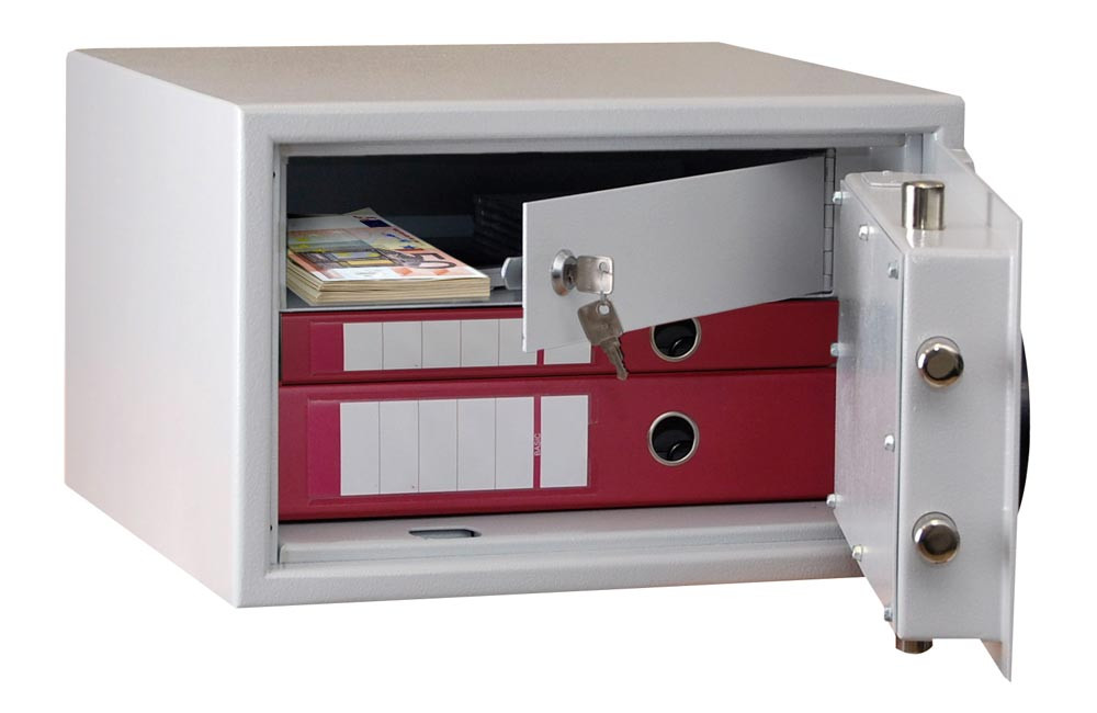 · Tür doppelwandig 53 mm stark, mit dreiseitiger Verriegelung durch Schließbolzen (20 mm) · Scharnierseite mit starren Bolzen gesichert · Hochwertige Feuerisolierung und umlaufende Feuerfalz · Beschlag und Scharniere 13 mm vorstehend · Türöffnungswinkel 180° · Innentresor 73 mm hoch mit Zylinderschloss inkl. 2 Schlüsseln · Je zwei Bohrungen in Rückwand und Boden zur Befestigung · Lackierung in RAL 7035 lichtgrau