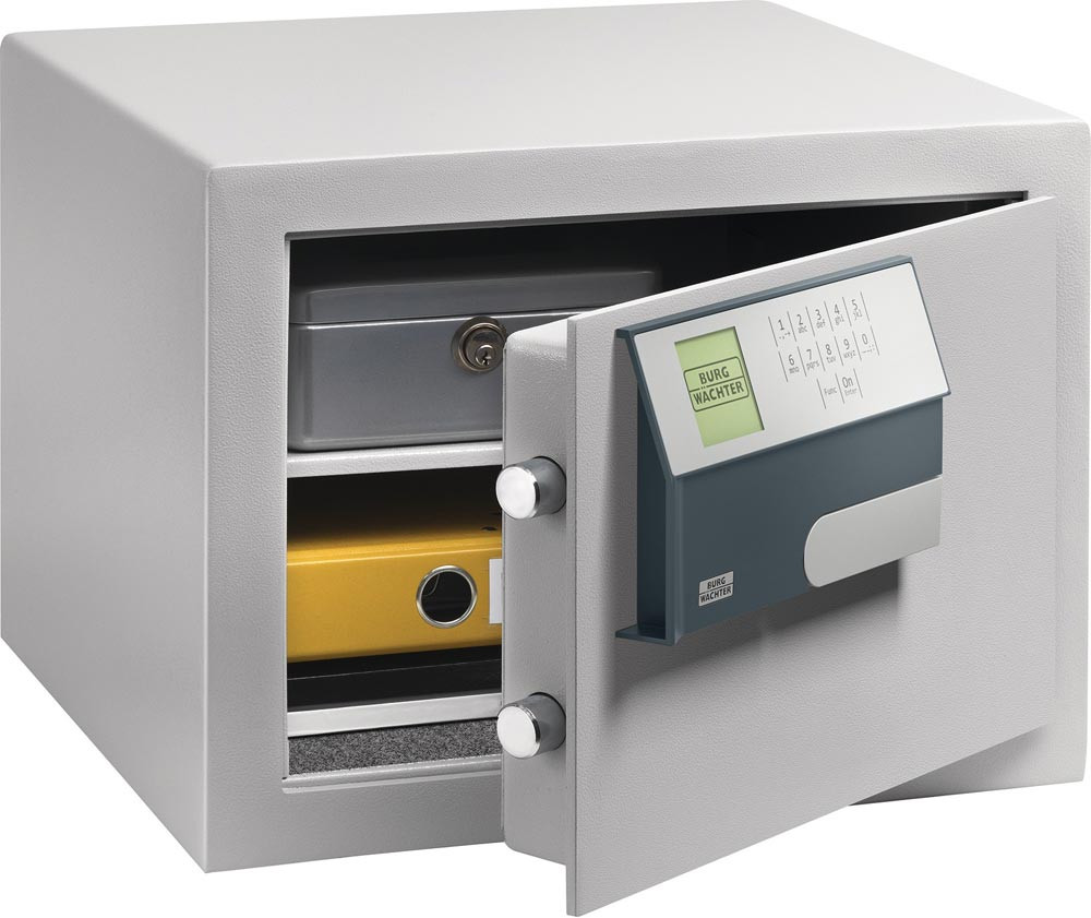 Sicherheitsstufe B nach. VDMA 24992 (Stand: Mai 1995). Feuerschutzmaterial nach. DIN 4102-A1. Mit umlaufendem Feuerfalz. Lackierung: Lichtgrau (RAL 7035). Doppelwandig. Verriegelung durch Rundbolzen. Verankerungsmöglichkeit in der. Rückwand und im Boden · je zwei. Rückwand- und Bodenbohrungen. Innenraum in Ordnertiefe Ausführung E SecuTronic. Programmierbares. elektronisches Zahlenschloss. ECB?S-zertifiziert · Klasse A. 1.000.000 Einstellmöglichkeiten. 1 programmierbarer Admin- und. 1 programmierbarer Benutzer-Code. Inkl. vier Batterien Mignon LR 06 AA. Die Schlossarmatur. steht 25 mm vor