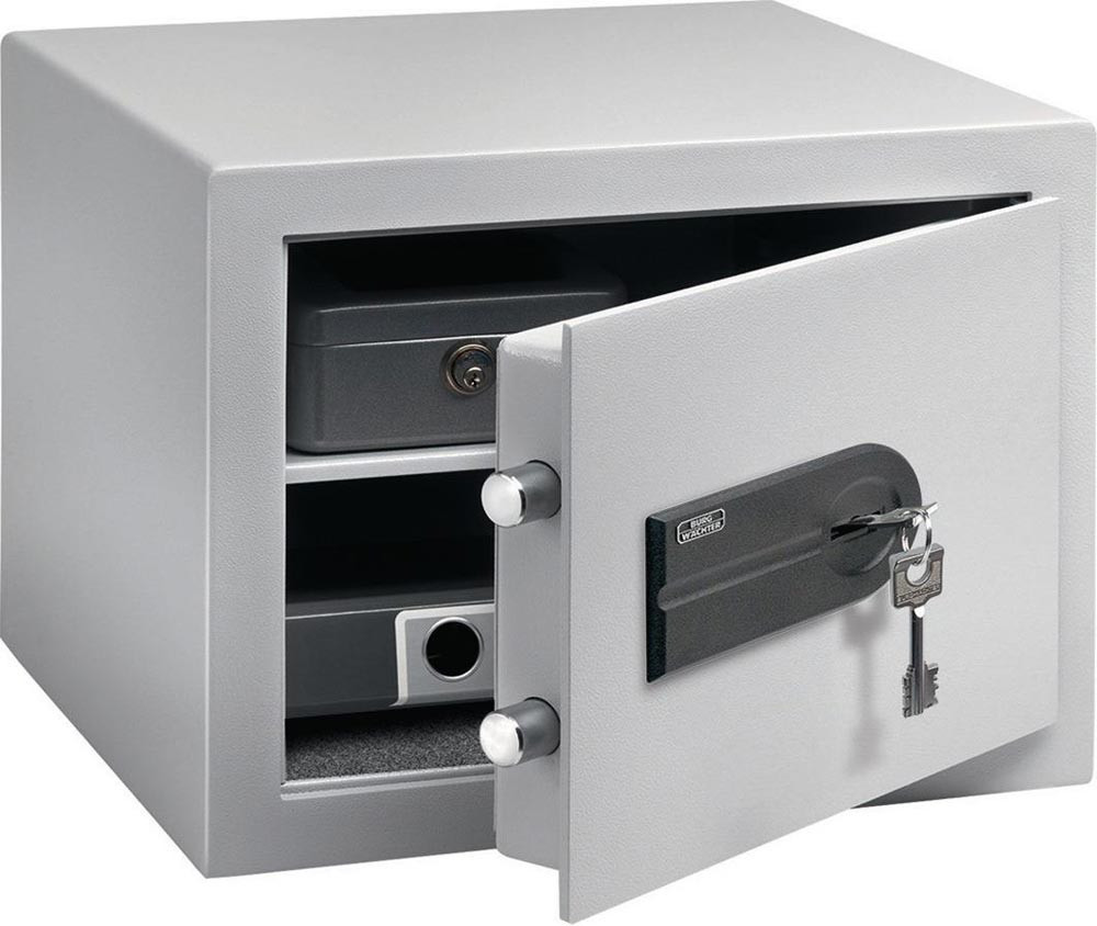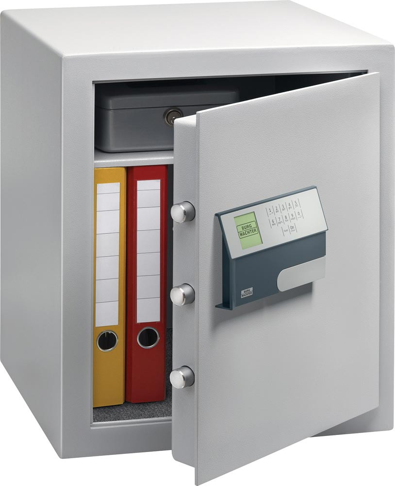 Sicherheitsstufe B nach. VDMA 24992 (Stand: Mai 1995). Feuerschutzmaterial nach. DIN 4102-A1. Mit umlaufendem Feuerfalz. Lackierung: Lichtgrau (RAL 7035). Doppelwandig. Verriegelung durch Rundbolzen. Verankerungsmöglichkeit in der. Rückwand und im Boden · je zwei. Rückwand- und Bodenbohrungen. Innenraum in Ordnertiefe Ausführung E SecuTronic. Programmierbares. elektronisches Zahlenschloss. ECB?S-zertifiziert · Klasse A. 1.000.000 Einstellmöglichkeiten. 1 programmierbarer Admin- und. 1 programmierbarer Benutzer-Code. Inkl. vier Batterien Mignon LR 06 AA. Die Schlossarmatur. steht 25 mm vor