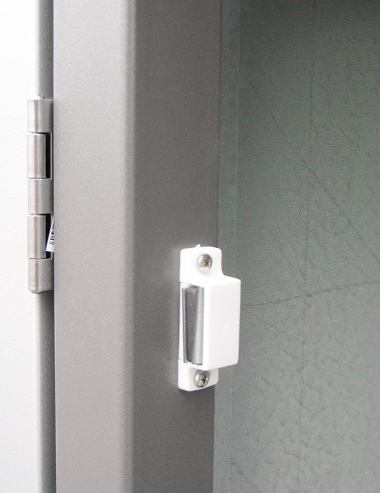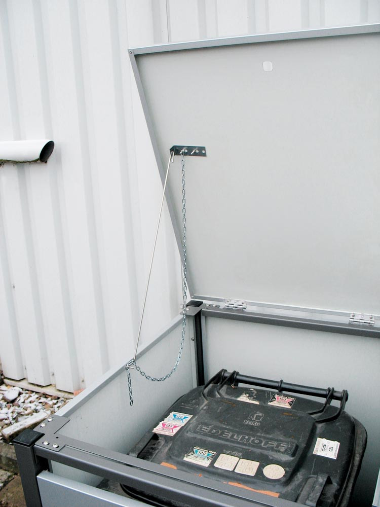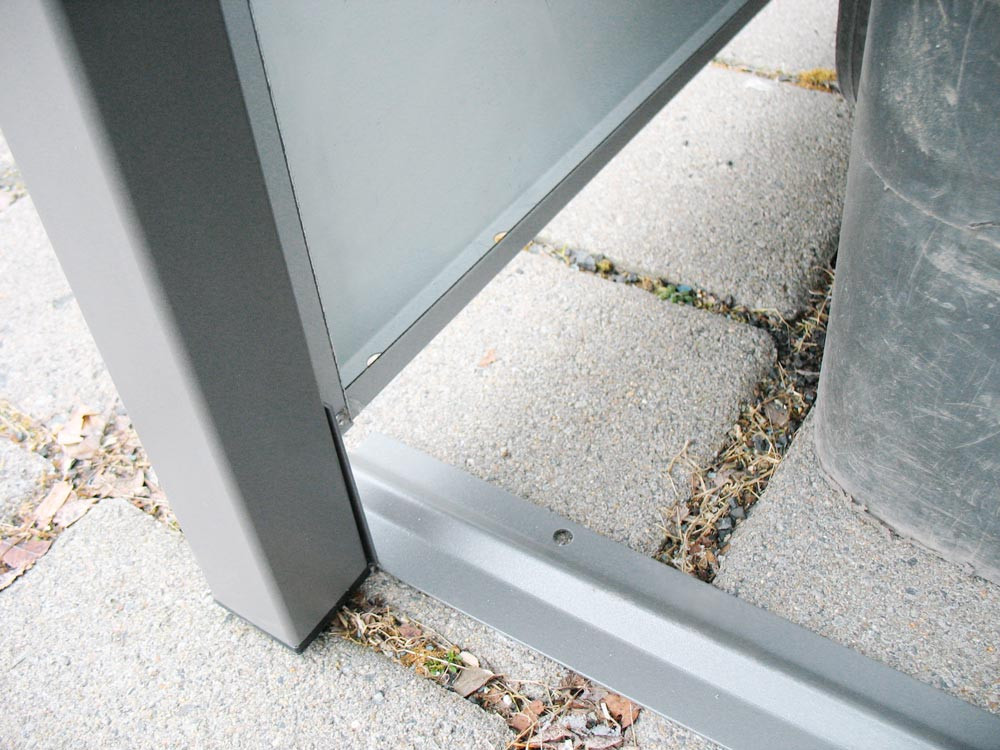 ∙ Für 240 Liter Tonnen ∙ Aus feuerverzinktem, pulverbeschichteten Stahlblech ∙ Türen und Wände mit Mehrfachkantung und in den Ecken zusätzlich vernietet ∙ Schrauben und Scharniere aus Edelstahl ∙ Pfosten mit Höhenverstellstopfen ∙ Pro Türe zwei Magnetschnapper ∙ Öffnungswinkel der Türen 180°