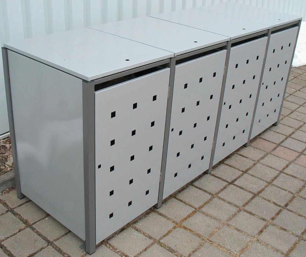 Mülltonnenverkleidung aus feuerverzinktem Stahlblech, BxTxH 680x830x1160 mm m. Klappdach, für 1 Tonne, Stanzung 3/5, Farbe RAL7004/RAL9006 E1982633