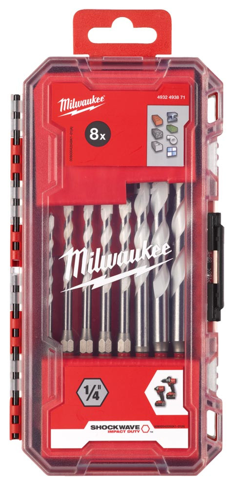 Lieferumfang: Bohrer: Ø 4 x 100 mm, jeweils 2x Ø 5 / 6 x 108 mm, Ø 8 / 10 x 120 mm, Ø 12 x 150 mm in PACKOUTTM kompatibler Kassette