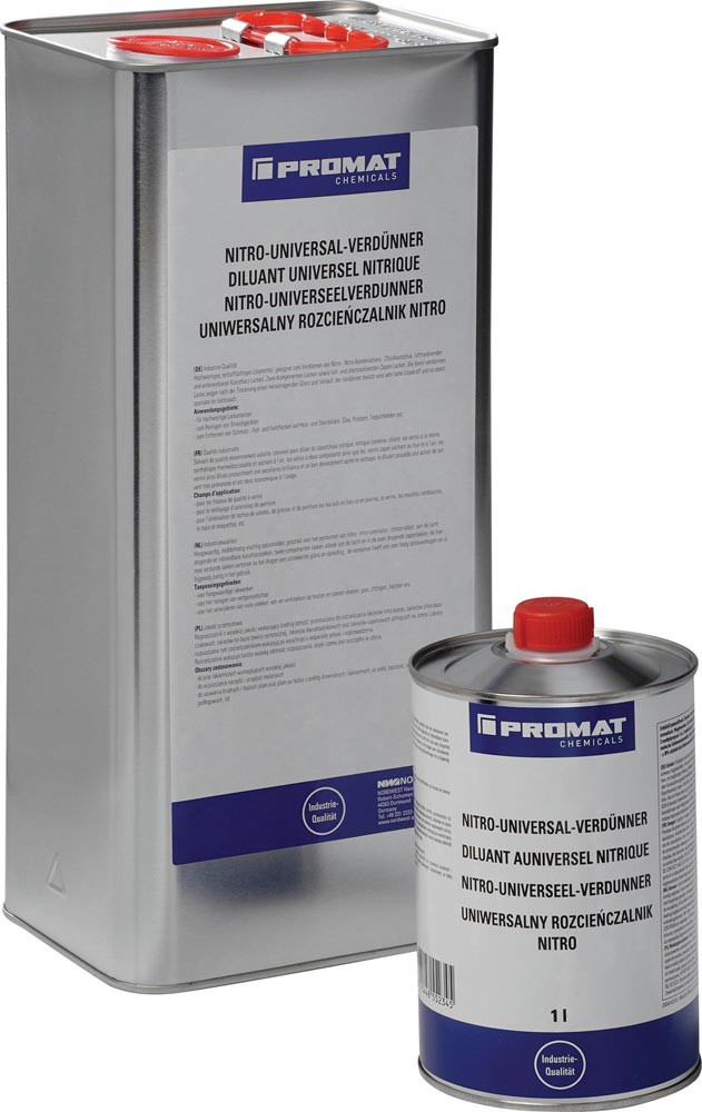zum Verdünnen von Nitro-, Nitro-Kombinations-, Chlorkautschuk, lufttrocknenden und einbrennbaren Kunstharz-Lacken, Zwei-Komponenten-Lacken sowie luft- und ofentrocknenden Zapon-Lacken · sehr hohe Lösekraft · sparsam im Verbrauch · zum Reinigen von Streichgeräten · zum Entfernen von Schmutz-, Fett- und Farbflecken auf Holz- und Steinböden, Glas, Polstern, Teppichböden etc. · Dichte: 0,85 · Verdunstungszahl: 8 (Ether = 1)