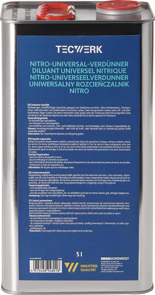 zum Verdünnen von Nitro-, Nitro-Kombinations-, Chlorkautschuk, lufttrocknenden und einbrennbaren Kunstharz-Lacken, Zwei-Komponenten-Lacken sowie luft- und ofentrocknenden Zapon-Lacken · sehr hohe Lösekraft · sparsam im Verbrauch · zum Reinigen von Streichgeräten · zum Entfernen von Schmutz-, Fett- und Farbflecken auf Holz- und Steinböden, Glas, Polstern, Teppichböden etc. · Dichte: 0,85 · Verdunstungszahl: 8 (Ether = 1)