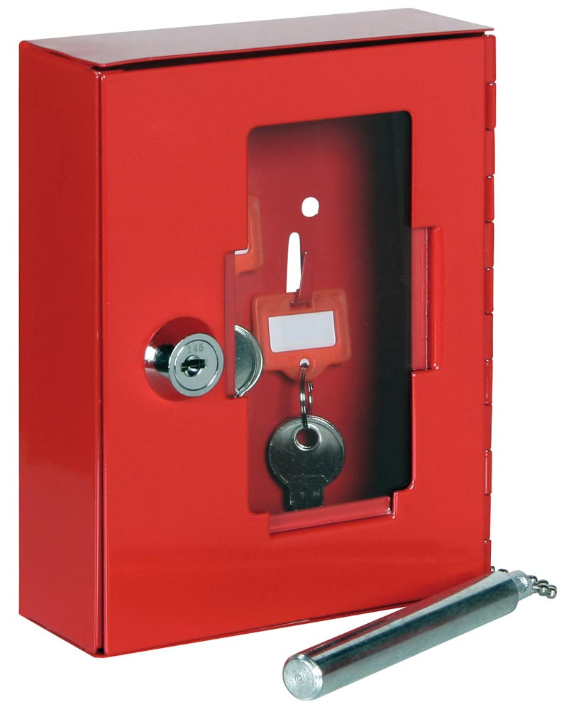 Notschlüsselkasten mit Klöppel, 2 Haken, auswechselbare Glasscheibe, Zylinderschloss, BxTxH 120x34x150 mm, rot