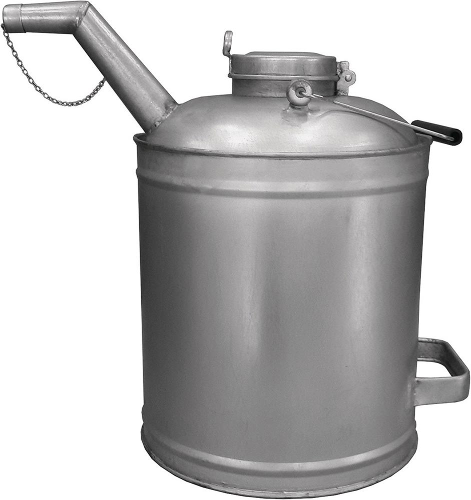aus stabilem voll verzinktem, dickwandigem Stahlblech (verhindert Flugrost, schützt vor Verbeulungen) · geeignet für selbst- und nicht selbstschmierende Medien, Heizöl und Diesel, Kühlmittel, Frostschutzmittel, leichte, nicht aggressive Chemikalien und wasserbasierende Medien · Auslaufrohr verschließbar mit einer Metallkappe · formstabiler und hitzebeständiger Metallauslauf