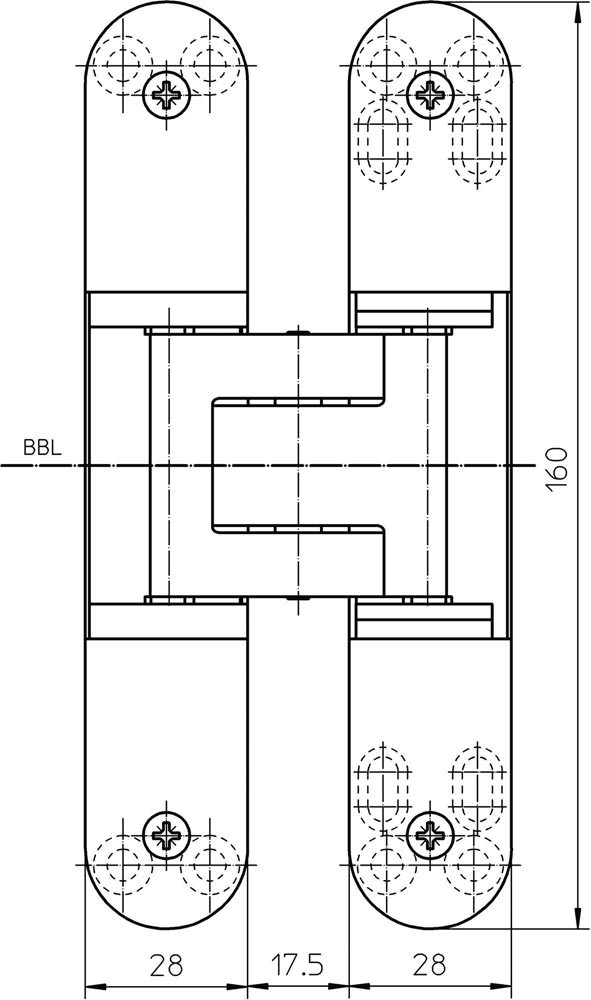 für ungefälzte Türen an Holz-, Stahl- oder Aluminiumzargen · Belastungswert bis 80 kg · Rollenlänge 160 mm · komplett verdeckt liegend · Öffnungswinkel bis 180° · wartungsfreie Gleitlagertechnik · dreidimensional verstellbar · Seite verstellbar +/- 3 mm · Höhe verstellbar +/- 3 mm · Andruck verstellbar +/- 1,5 mm · DIN links / rechts verwendbar