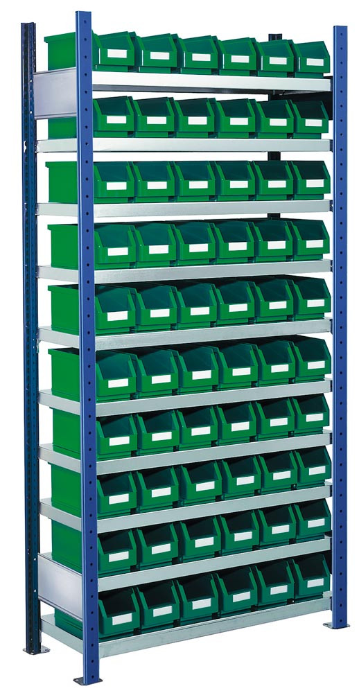 ∙ Steckregalsystem mit Winkelprofilen und verzinkten Fachböden, das jederzeit problemlos auf- und abgebaut werden kann ∙ Ausstattung mit Fachböden und Sichtlagerkästen aus Polyethylen ∙ Rahmen RAL 5010 enzianblau, Böden und Tiefenriegel verzinkt ∙ Fachboden-Traglast: 125 kg, (bei gleichmäßig verteilter Last) ∙ Die Bestückung mit Sichtlagerkästen erfolgt je Größe und farblich sortiert