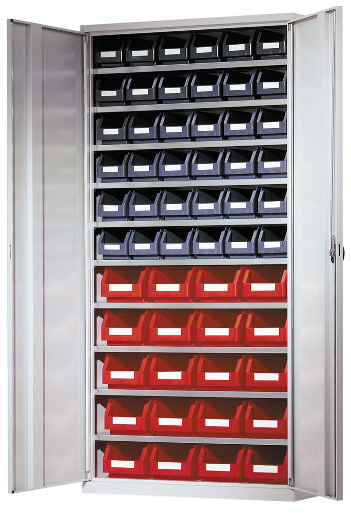 · Solide, innen und aussen schlag- und kratzfeste Stahlkonstruktion mit Kunststoffbeschichtung in RAL 7035 lichtgrau · Fachböden aus verzinktem Stahlblech, im Raster von 15 mm verstellbar · Tür-Öffnungswinkel über 180° · Dreiriegeliges Sicherheits-Zylinderschloss mit versenkbarem Drehgriff · Die Bestückung mit Sichtlagerkästen erfolgt je Größe und farblich sortiert