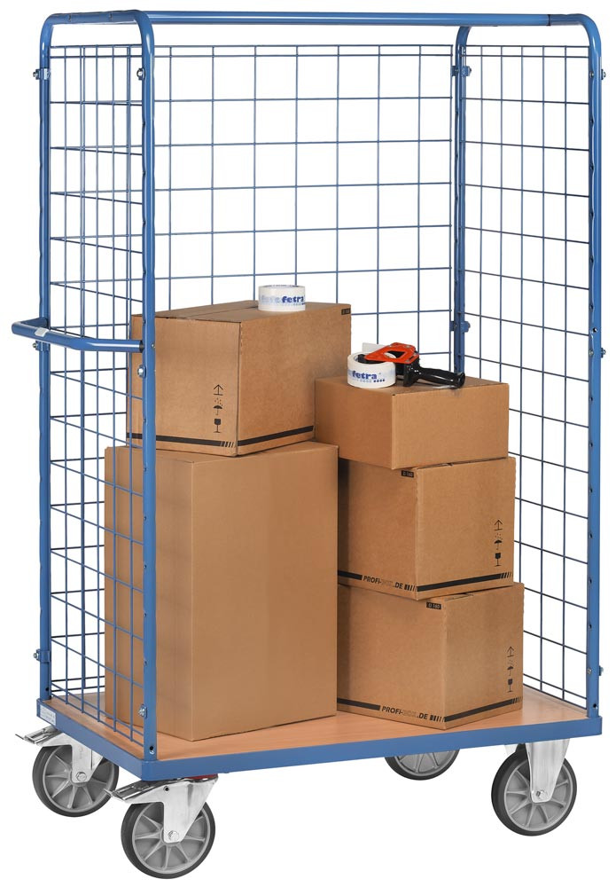 Paketwagen, 3 Gitterwände, Ladefläche LxB 1200x800 mm Außenmaße LxBxH 1369x809x1800 mm, Traglast 600 kg, RAL 5007 brillantblau E6041072