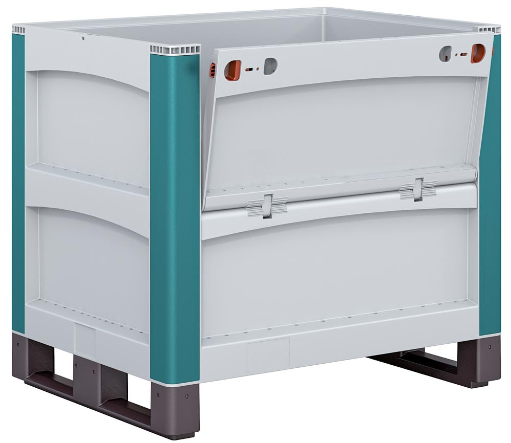 ∙ Gelungene Alternative zur bekannten Gitterbox, da die Palettenboxen sich Ihrem Bedarf entsprechend anpassen ∙ Um ein Vielfaches leichter als Metallboxen ∙ 3-fach stapelbar ∙ Standardfarbe grau, Ecken grün