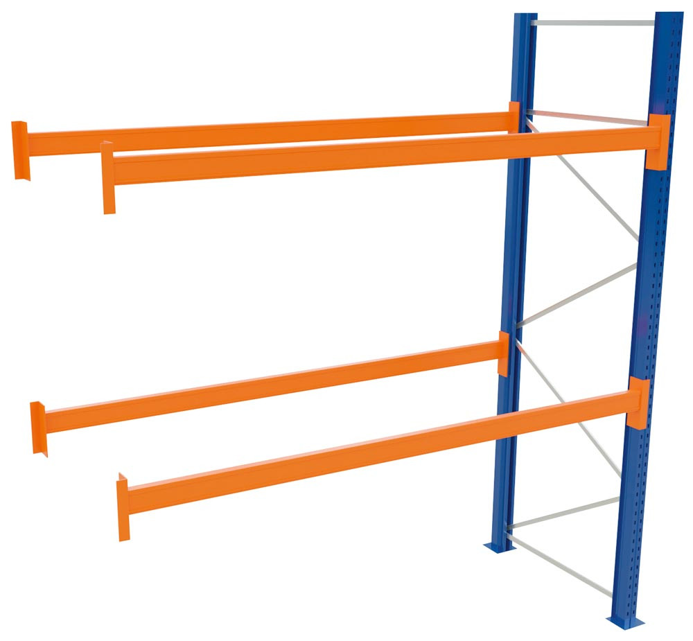 Palettenregal, Anbaufeld, BxTxH 2786x1100x4000 mm, 3 Lagerebenen, Fachlast 1500 kg, Feldlast 5287 kg, Rahmen blau, Holme reinorange E6022063