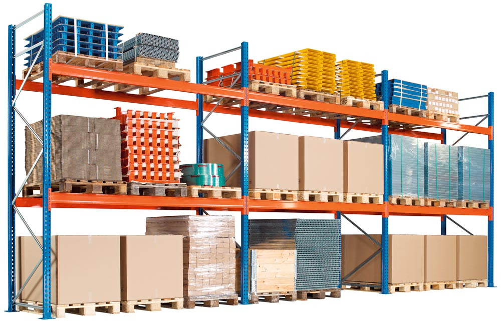 Palettenregal-Set, BxTxH 8444x1100x4000 mm, 3 Lagerebenen, Fachlast 1500 kg, Feldlast 5287 kg, Rahmen blau, Holme reinorange E6022060