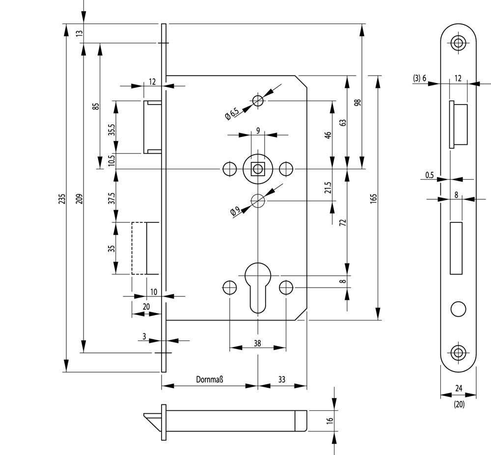 Panik-Wechselfunktion E · für einflügelige Holz- oder Stahltüren · in Kombination mit geprüften Beschlägen nach EN 179 (Notausgänge) und nach EN 1125 (Paniktüren) zugelassen ·Feuerschutzeignung · zweitourig · 1-teilige Nuss · vorgerichtet für Profilzylinder · Falle und Riegel aus Stahl · Entfernung 72 mm · Vierkant 9 mm · Stulplänge 235 mm · allseitig geschlossener Schlosskasten
