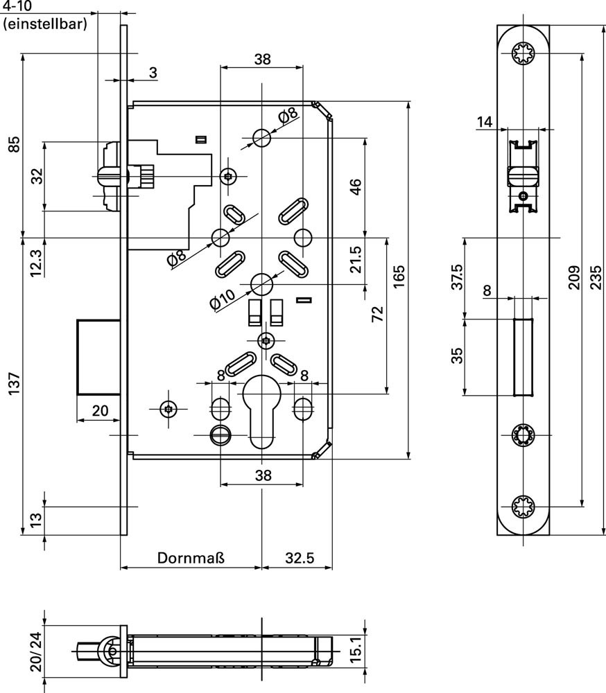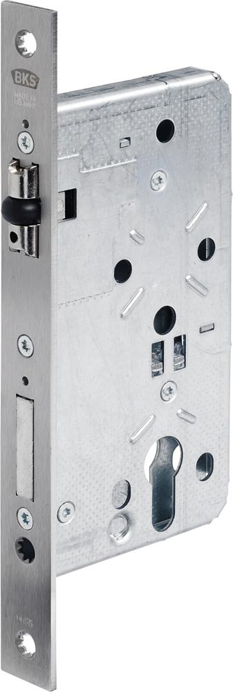 PZ Ausführung mit Rollfalle · allseitig geschlossener Schlosskasten · Stulplänge 235 mm · Dornmaß 55 mm · DIN links / rechts verwendbar · Rollfalle aus Zinkdruckguss mit Kunststoffrolle für besonders leises Schließen · Riegel 1-tourig 20 mm aus Zinkdruckguss · Entfernung 72 mm · ohne Schließblech