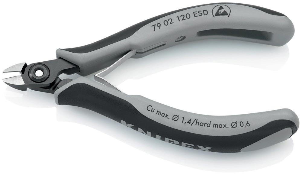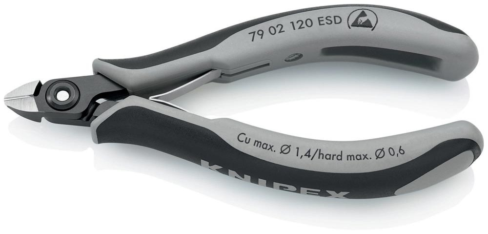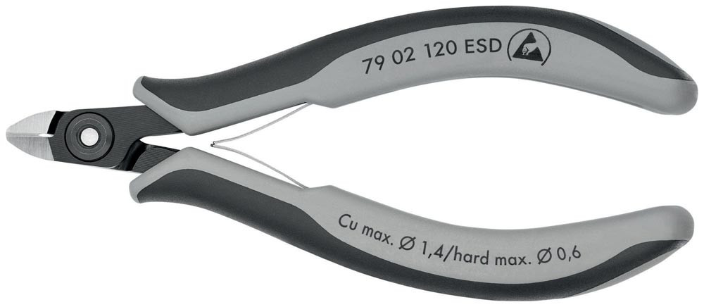 ESD · für feinste Schneidarbeiten z. B. in Elektronik und Feinmechanik · geschliffene, scharfe Schneiden · Schneiden zusätzlich induktiv gehärtet, Schneidenhärte ca. min. 64 HRC · ca. 20% weniger Gewicht · geschraubtes Gelenk · Öffnungsfeder · Chrom-Vanadin-Kugellagerstahl, geschmiedet, mehrstufig ölgehärtet · elektrisch ableitend - dissipativ