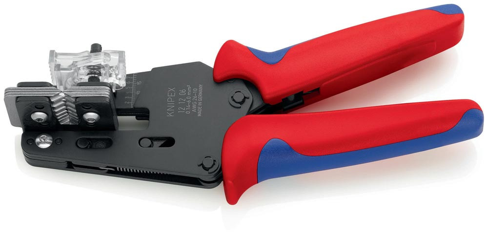 mit Formmessern · formschlüssiges Abisolieren auch von schwer zu entfernenden Isolierwerkstoffen aus PTFE, Silikon, Radox®, Kapton® und Gummi, auch mehrlagig · mit einstellbarem Längenanschlag für gleiche Abisolierlängen bei Serienarbeit · 4 auswechselbare Messer · Zangenkörper: Stahl · Messer: Spezial-Werkzeugstahl, ölgehärtet