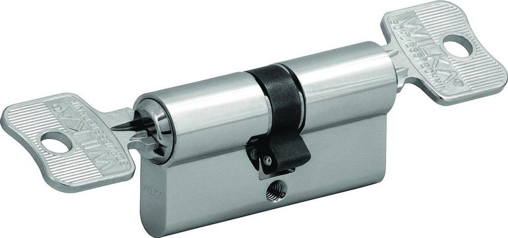 Wendeschlüssel · mit Not- und Gefahrenfunktion beidseitig · verschiedenschließend · gefertigt nach DIN 18252 und EN 1303 · massiv Messing matt vernickelt · 6 Stiftzuhaltungen einreihig · mit je 3 Wendeschlüsseln Messing glänzend vernickelt · Hantelstifte als Pickingwiderstand · Kernstifte Sondermessing · 1 Gehäuse-Stahlstift als Anbohrhemmung · Federn Edelstahl rostfrei · balliger Zylinderkern für exakte Schlüsselführung