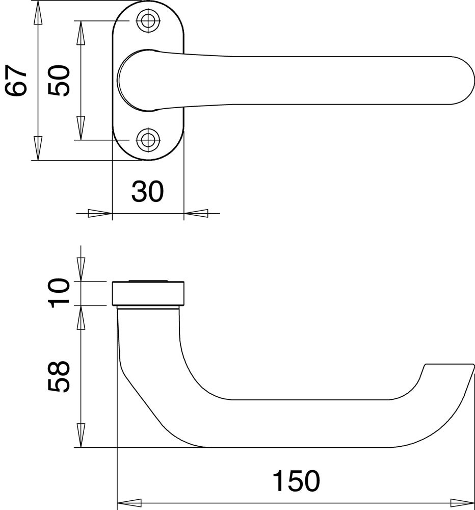 für Rahmentüren · schräg, fest-drehbar auf ovaler Massivrosette · Rosette: Stärke 10 mm · Höhe 67 mm · Breite 30 mm · Schraublochabstand 50 mm · sichtbare Verschraubung · DIN links / rechts · Lieferung ohne Stift und Schrauben