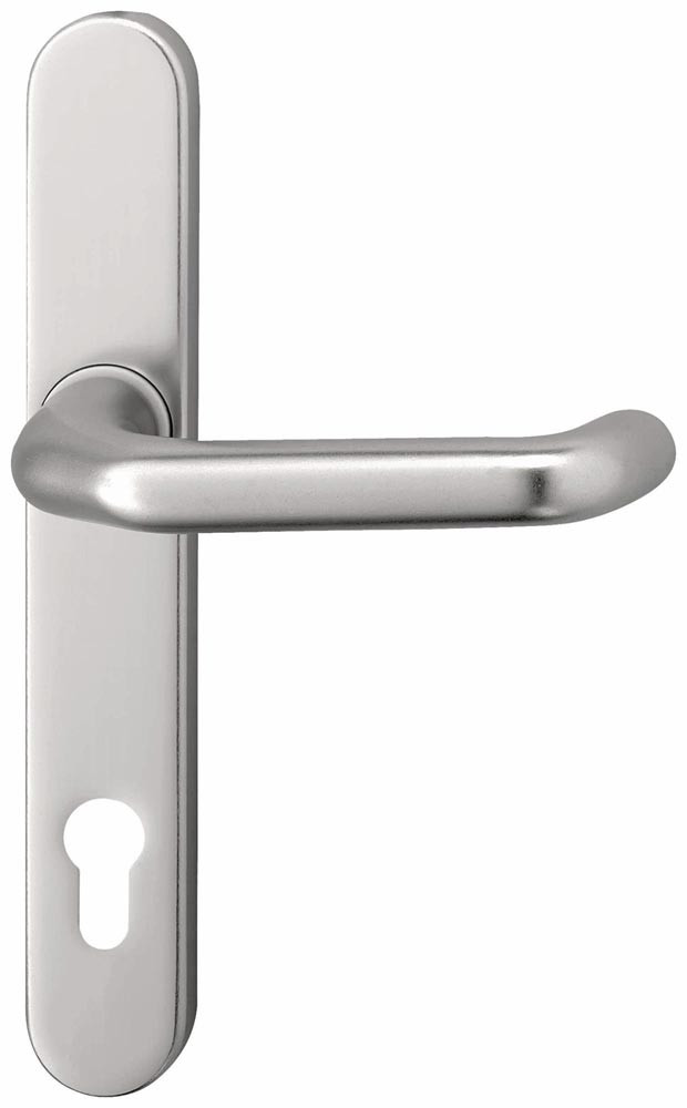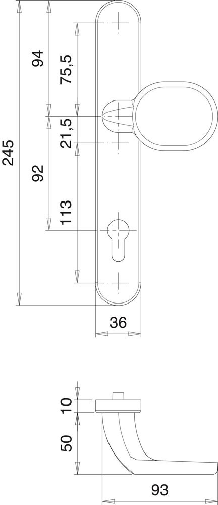 Wechselgarnitur für Rahmentüren · Entfernung 92 mm · Vierkant 8 mm · PZ-gelocht · Drücker fest-drehbar gelagert · mit Hochhaltefeder · Clipschildtechnik auf Druckgussunterkonstruktion · Stärke 10 mm · Höhe 245 mm · Breite 36 mm · Verschraubung von innen nach außen · unsichtbar verschraubt · DIN links / rechts · Lieferung ohne Stift und Schrauben