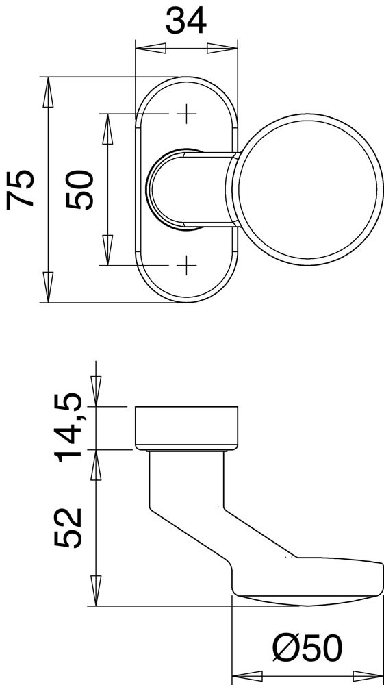 für Rahmentüren · schräg, auf ovaler Rosette · mit unsichtbarer Befestigung · Höhe 75 mm · Breite 34 mm · Stärke 14,5 mm · Schraublochabstand 50 mm · fest oder fest/drehbar (federnd gelagert) · DIN links / rechts · Lieferung ohne Stift und Schrauben