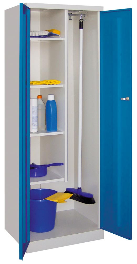 Putzmittelschr. mit Sockel, mittig verk. Trennw., li. 4, Böden, Stange mit 3 Haken, BxTxH 600x500x1800 mm, RAL 5010 E1572319