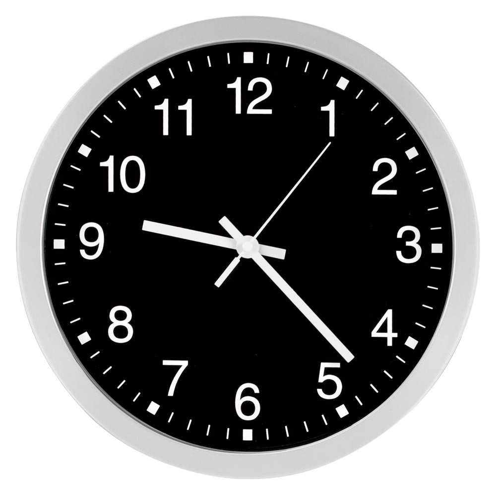 Quarz-Wanduhr, Durchm. 300 mm, Kunststoffgehäuse silber, Ziffernblatt schwarz, arabische Ziffern, inkl. Batterie