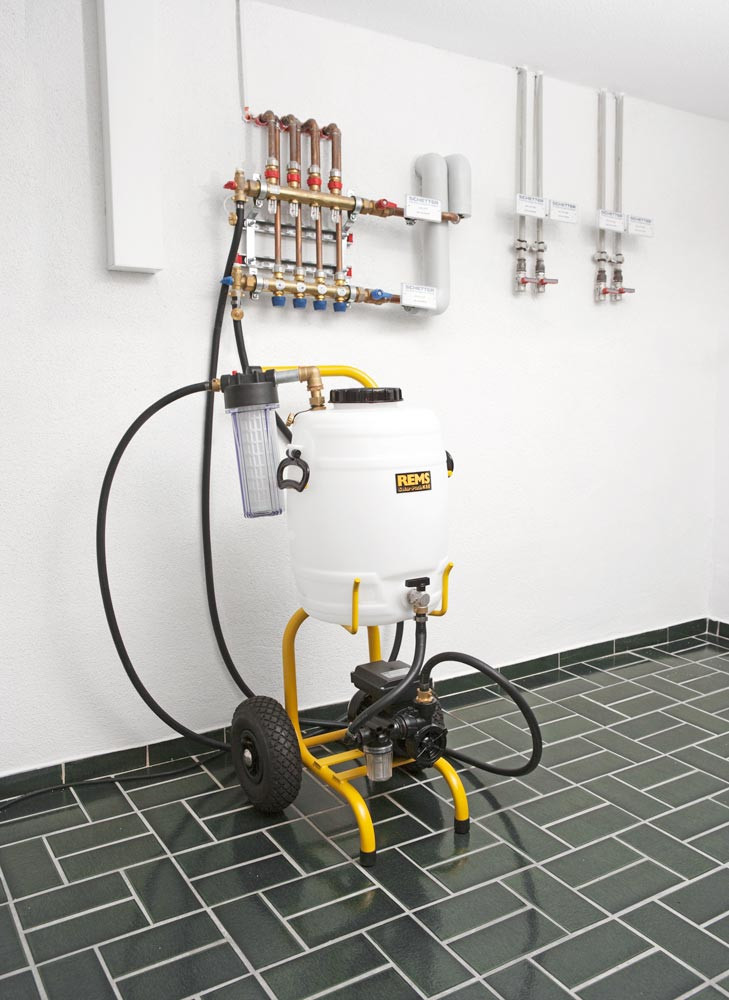 Ausführung: Leistungsstarke, elektrische Füll- und Spüleinheit zum einfachen und schnellen Füllen, Spülen und Entlüften von Systemen von geschlossenen Systemen mit Wärmeträgerflüssigkeiten, Frostschutzmittel, Wasser, wässerige Lösungen und Emulsionen ∙ Stabiler Kunststoff-Behälter mit großer Öffnung zum leichten Befüllen und praktischem Schraubdreckel ∙ Mit Kreiselpumpe, temperaturbeständig für Dauerbelastung ≤ 60° C ∙ Durchzugstarker Kondensatormotor 860 Watt mit thermischem Motorschutz ∙ Ein-Ausschalter ∙ Im Karton