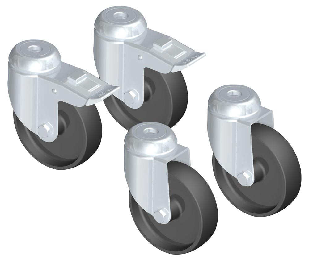 Rädersatz, bestehend aus 4 Lenkrollen, 2 davon mit Feststeller, Bauhöhe 90 mm