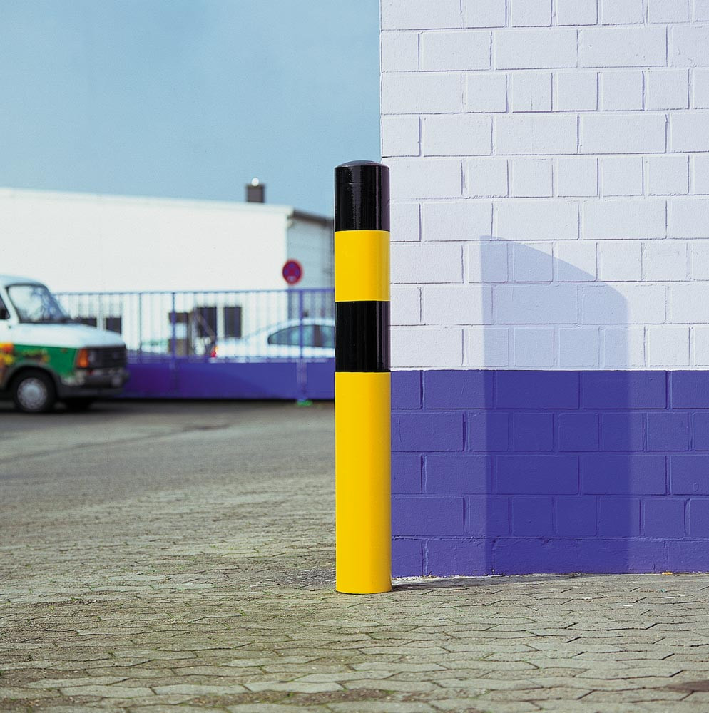 Rammschutz-Poller zum Einbetonieren, feuerverzinkt und gelb kunststoffbeschichtet mit schwarzen Signalstreifen, Durchm. 90 mm, Höhe 1600 mm E6019973