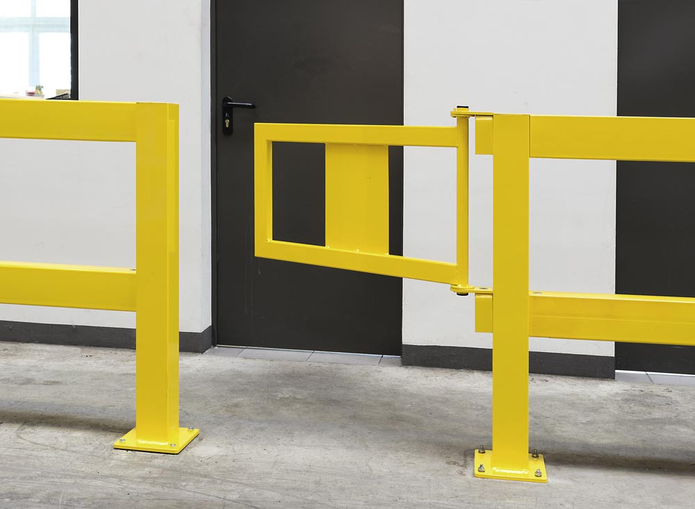 · Kunststoffbeschichtet in gelb · Mit eingeschweißter Schutzblende für erhöhte Stabilität und zum Anbringen von Warnhinweisen · Variabel in der Anwendung - Pfostenanschlag rechts oder links und 90° Öffnung nach innen oder außen