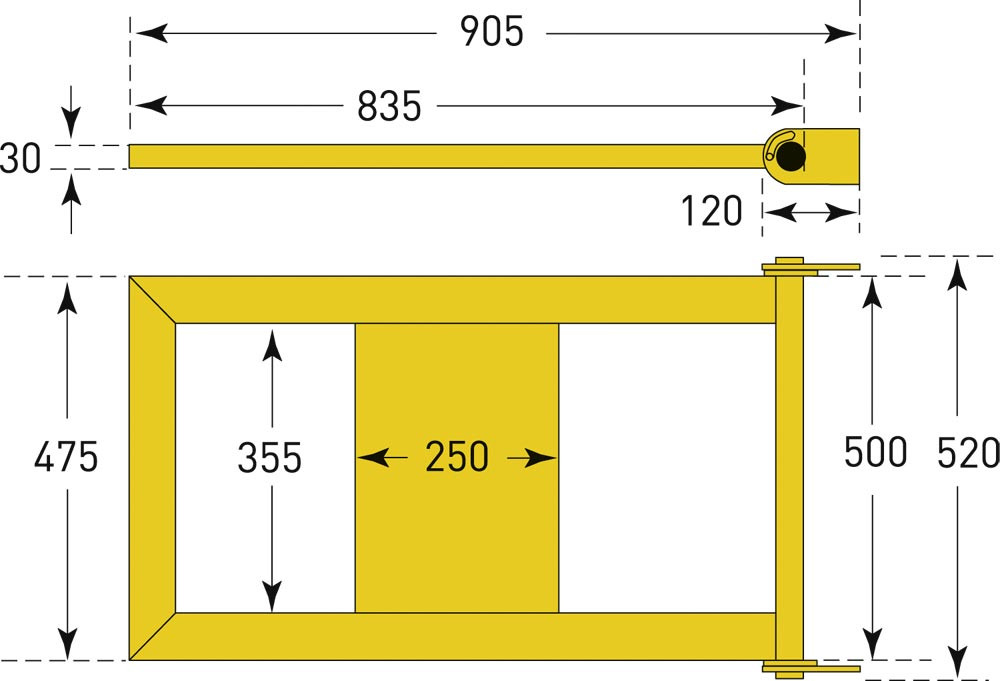 Rammschutzgeländer, Tür mit Gasdruckfeder, BxH 835x475 mm, Tür mit Beschlag 905x520 mm, gelb kunststoffbeschichtet E6041332