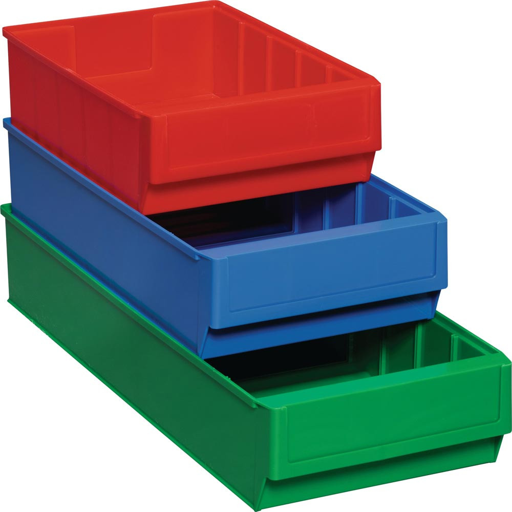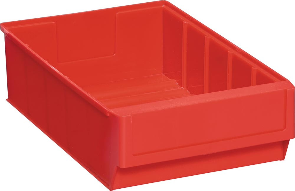 aus hochwertigem Polypropylen · rot · weitgehend beständig gegen die meisten Säuren und Öle · temperaturbeständig von -20 °C bis +80 °C · gewellter Innenboden für die leichte Entnahme von Kleinteilen · robuste Griffmulde mit großer Fläche für Beschriftungsetiketten (s. Zubehör) · variabel einsetzbar durch umsteckbare Trennwände (s. Zubehör) · die optionale Auszugssperre verhindert das Herausrutschen der Box aus dem Regal
