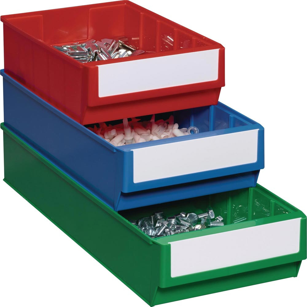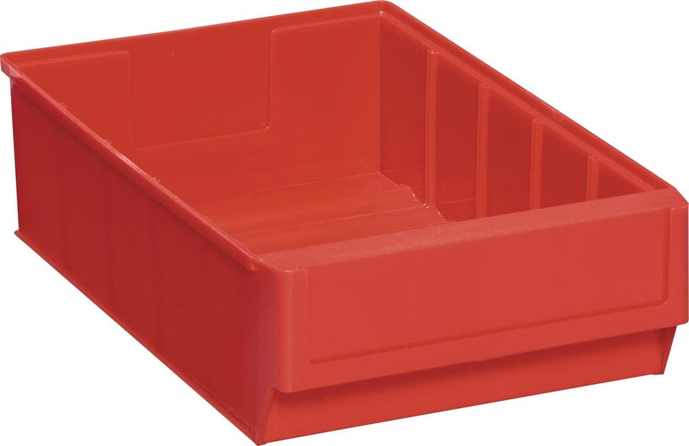 aus hochwertigem Polypropylen · rot · weitgehend beständig gegen die meisten Säuren und Öle · temperaturbeständig von -20 °C bis +80 °C · gewellter Innenboden für die leichte Entnahme von Kleinteilen · robuste Griffmulde mit großer Fläche für Beschriftungsetiketten (s. Zubehör) · variabel einsetzbar durch umsteckbare Trennwände (s. Zubehör) · die optionale Auszugssperre verhindert das Herausrutschen der Box aus dem Regal
