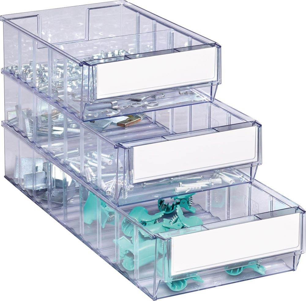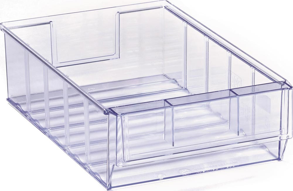 aus SAN · transparent · weitgehend beständig gegen die meisten Säuren und Öle · temperaturbeständig von -20 °C bis +80 °C · gewellter Innenboden für die leichte Entnahme von Kleinteilen · robuste Griffmulde mit großer Fläche für Beschriftungsetiketten (s. Zubehör) · variabel einsetzbar durch umsteckbare Trennwände (s. Zubehör) · die optionale Auszugssperre verhindert das Herausrutschen der Box aus dem Regal